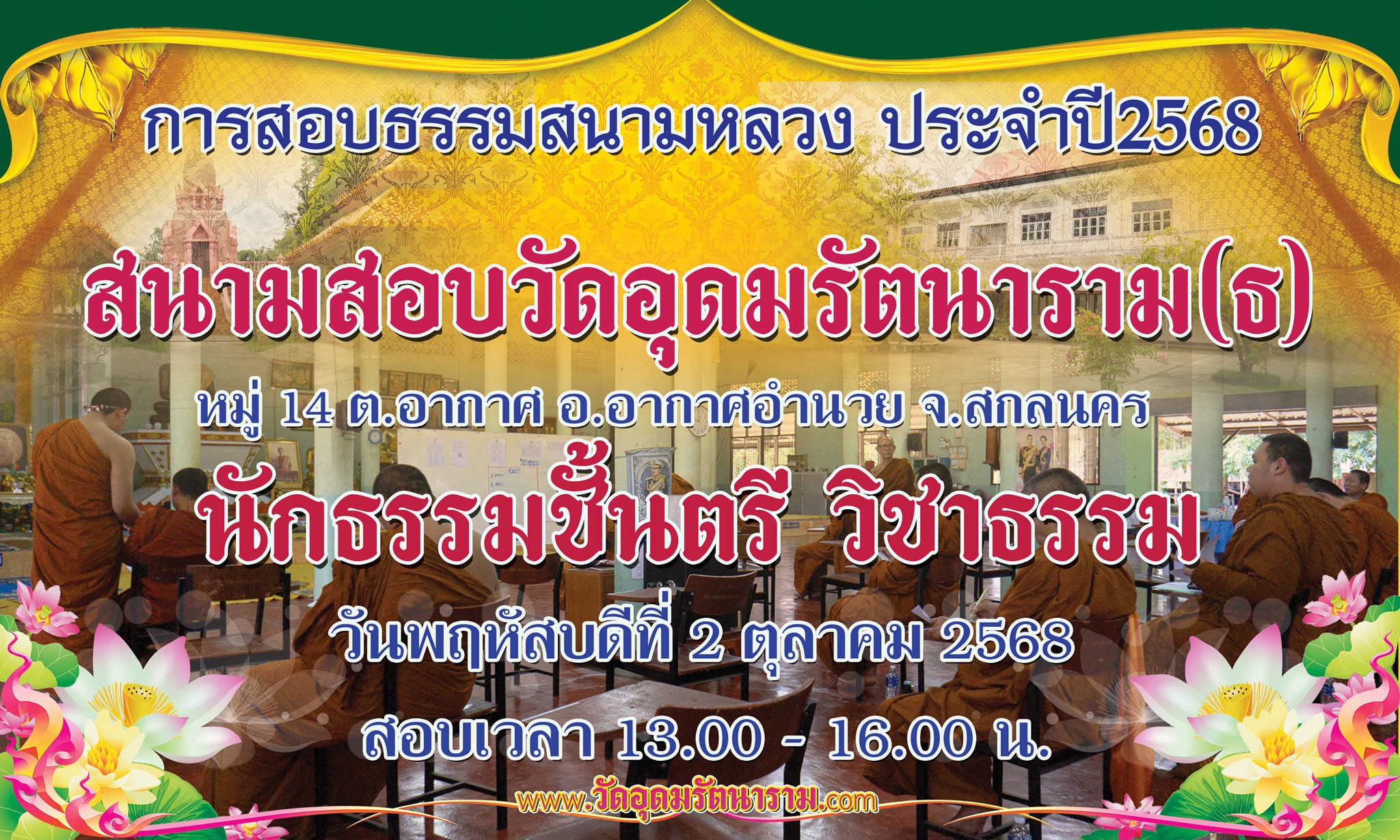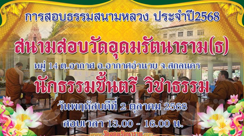 ข่าวกิจกรรม การสอบธรรมสนามหลวง๒ตุลาคม๒๕๖๘ 2 October 2025 admin วันพฤหัสบดีที่ ๒ ตุลาคม ๒๕๖๘ ขึ้น ๑๐ ค่ำ เดือน ๑๑ ปีมะเส็ง การสอบธรรมสนามหลวง นักธรรมชั้นตรี วิชาธรรม ณ ศาลาการเปรียญวัดอุดมรัตนาราม(ธ) หมู่๑๔ ตำบลอากาศ อำเภออากาศอำนวย จังหวัดสกลนคร