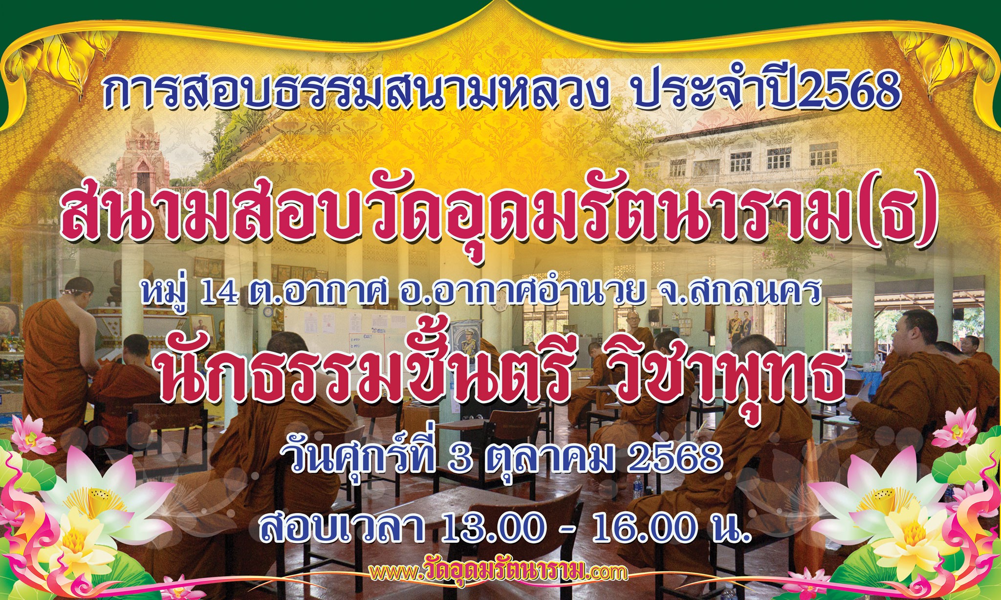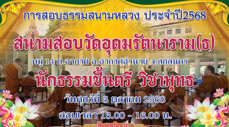 ข่าวกิจกรรม การสอบธรรมสนามหลวง๓ตุลาคม๒๕๖๘ 3 October 2025 admin วันศุกร์ที่ ๓ ตุลาคม ๒๕๖๘ ขึ้น ๑๑ ค่ำ เดือน ๑๑ ปีมะเส็ง การสอบธรรมสนามหลวง นักธรรมชั้นตรี ณ ศาลาการเปรียญวัดอุดมรัตนาราม(ธ) หมู่๑๔ ตำบลอากาศ อำเภออากาศอำนวย จังหวัดสกลนคร