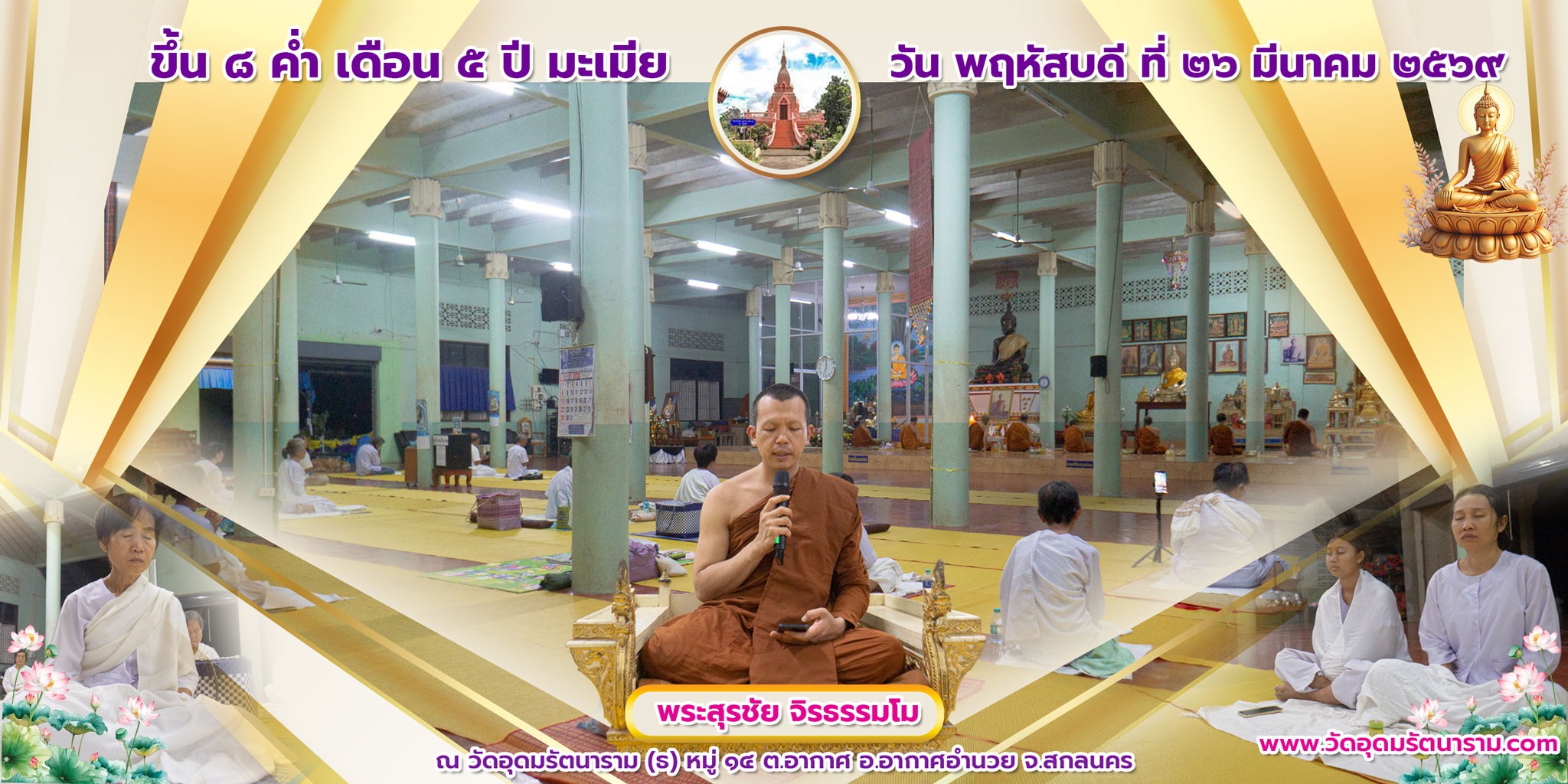 ข่าวกิจกรรม ขึ้น ๘ ค่ำ เดือน ๕ 27 March 2026 admin วันพฤหัสบดีที่ ๒๖ มีนาคม ๒๕๖๙ ขึ้น ๘ ค่ำ เดือน ๕ แสดงธรรมโดยพระสุรชัย จิรธรรมโม ณ วัดอุดมรัตนาราม(ธ) หมู่ ๑๔ ต.อากาศ อ.อากาศอำนวย จ.สกลนคร ทุกวันพระมีการสวดมนต์ ฟังธรรม จำศีล ภาวนา เดินจงกรม นั่งสมาธิ (เริ่มเวลา ๑๘.๐๐ น.เป็นต้นไป)
