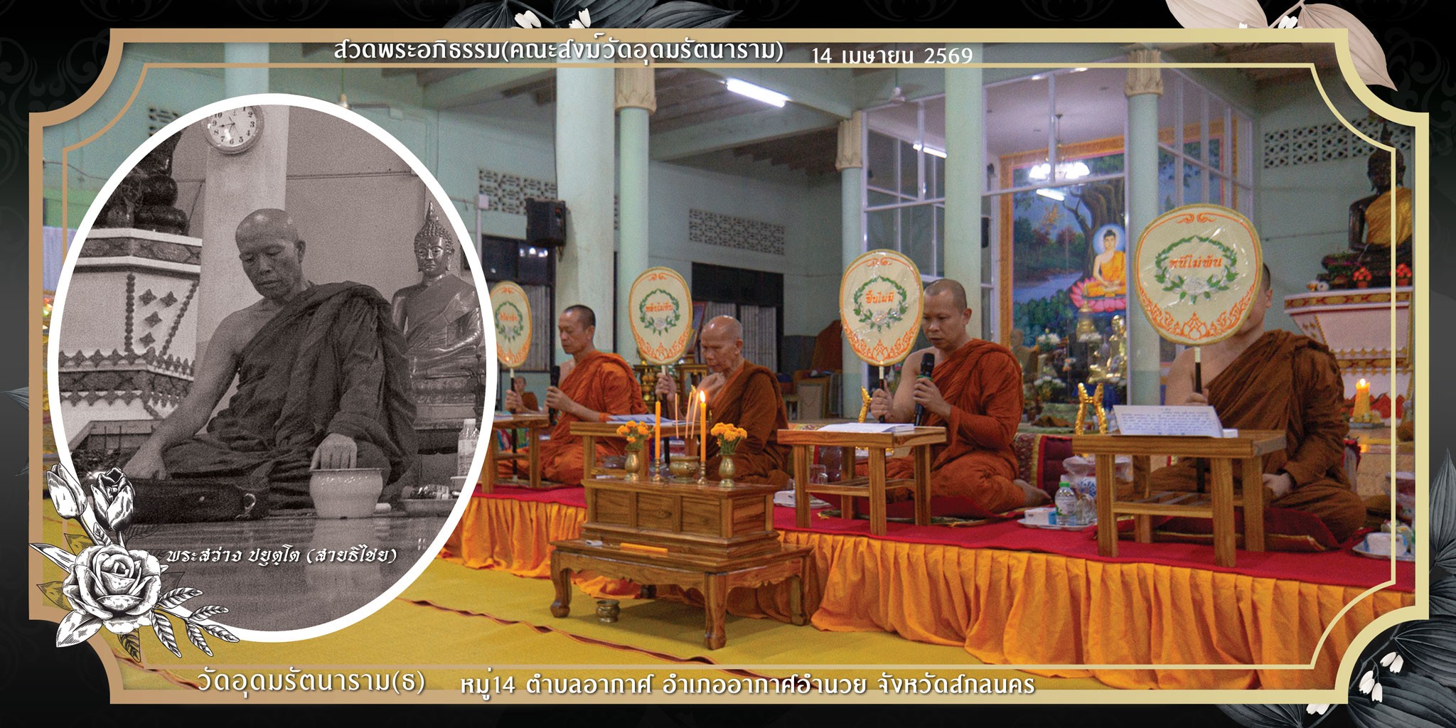 ข่าวกิจกรรม สวดพระอภิธรรม 16 April 2026 admin วันอังคารที่๑๔ เมษายน ๒๕๖๙ เวลา ๑๙.๐๐ น. สวดพระอภิธรรม พระสว่าง ปยุตฺโต ณ ศาลาการเปรียญ วัดอุดมรัตนาราม(ธ) หมู่๑๔ ตำบลอากาศ อำเภออากาศอำนวย จังหวัดสกลนคร
